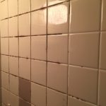 壁には目立つカビ汚れが付着しています。カビは養分となる水垢や石鹸カス汚れの上に付着するため、根元から汚れを取り除いていきます!