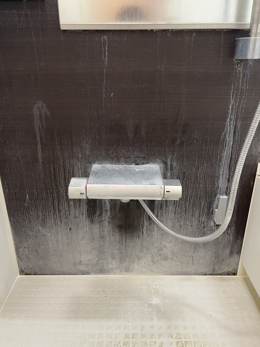 ご覧の通り、目立つ石鹸カス汚れ。とくにダークカラーの壁面パネルについた汚れは目立ちやすく、見た目の不快感を与えてしまいます。石鹸カスは、水に濡れるとヌメヌメ、乾くとパサパサした状態になり、堆積すると市販の洗剤で落とすのは大変です。