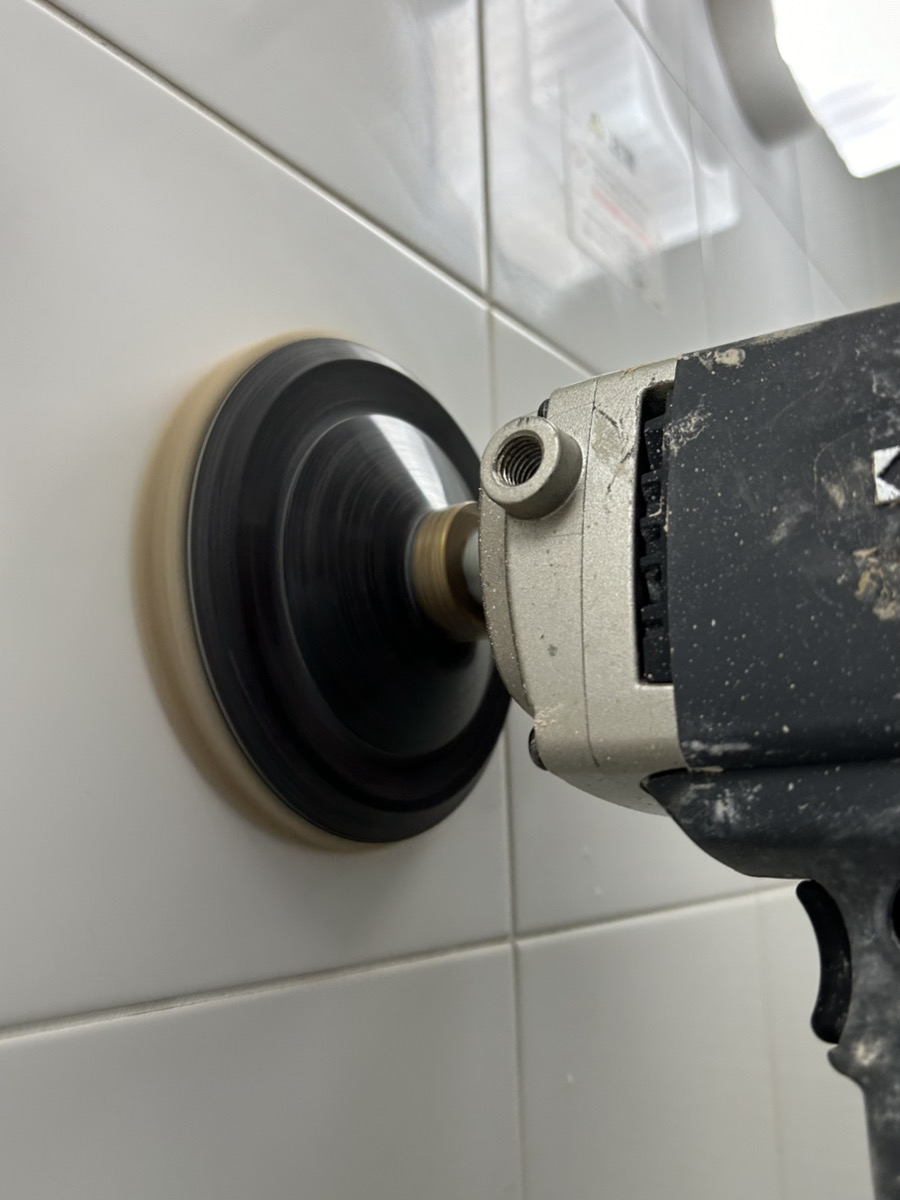 専用の道具とパッド、洗剤でタイル一枚ずつ丁寧に磨いていきます。