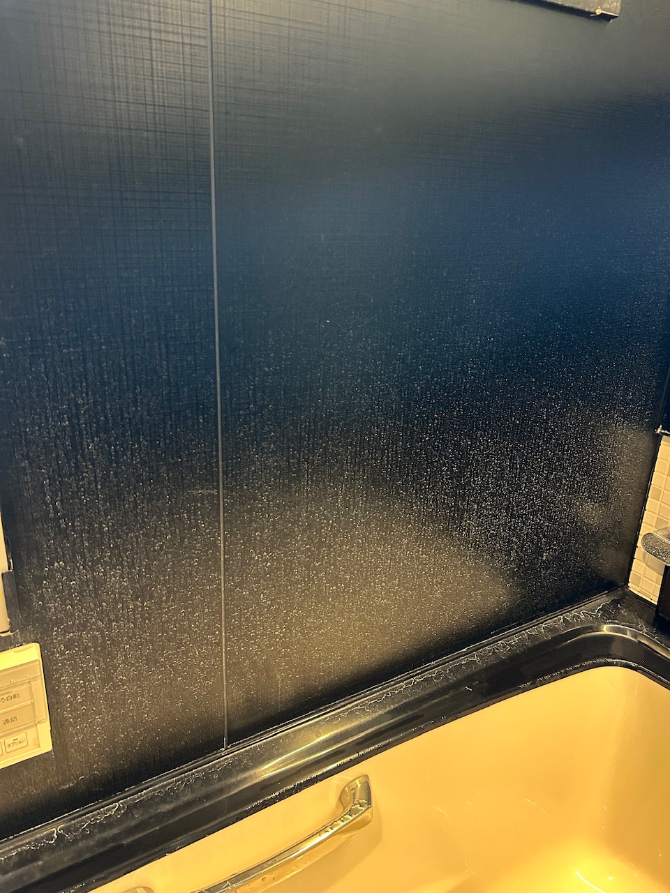 落ちない頑固な水垢、蓄積した石鹸カス汚れはプロ専用のケミカルで落としていきます。浴室で使われている素材に関係なく、汚ればかり意識して硬いものでガリガリと削り落としてしまうと素材にキズが入ります。キズがつくと、表面の凹凸に汚れが入り込み、さらに汚れやすい浴室になってしまいます。とくに今回のようなダーク系のパネルはキズも目立ちやすいので注意が必要です。
